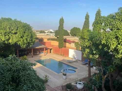 3 chambres spacieuses et climatisées (1 en bas et 2 à l'étage); Salon et salle à manger lumineux et climatisés; Cuisine américaine; Véranda et terrasses au rez de chaussée et à l'étage; Piscine de 8x4x1,5 m et pool house; Toilette visiteur; Jardin arboré avec une vingtaine de manguiers; Espace barbecue; Forage avec une pompe à haut débit; Réserve d’eau de 1000 litres; Branchement SDE et SENELEC (Woyofal); Canal wifi fibre optique; Studio gardien; Espace parking 4 voitures
